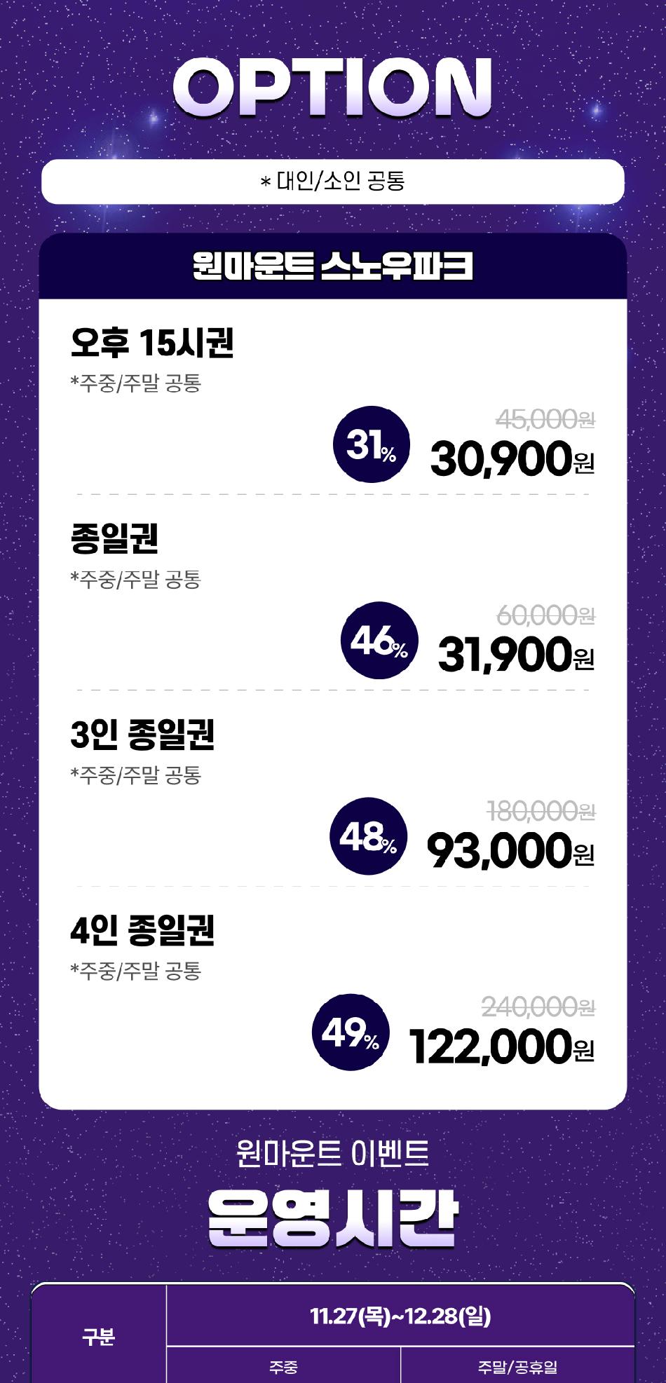 - 스노우파크 이용시 5시간 무료 (테마파크 2층 안내데스크에서 등록 시)