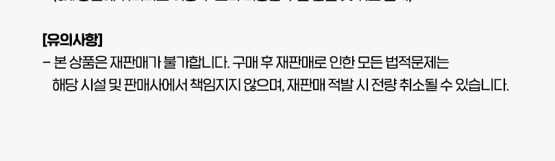 * 본 상품은 재판매가 불가합니다. 구매 후 재판매로 인한 모든 법적문제는 해당 시설 및 판매사에서 책임지지 않으며, 재판매 적발 시 전량 취소될 수 있습니다.