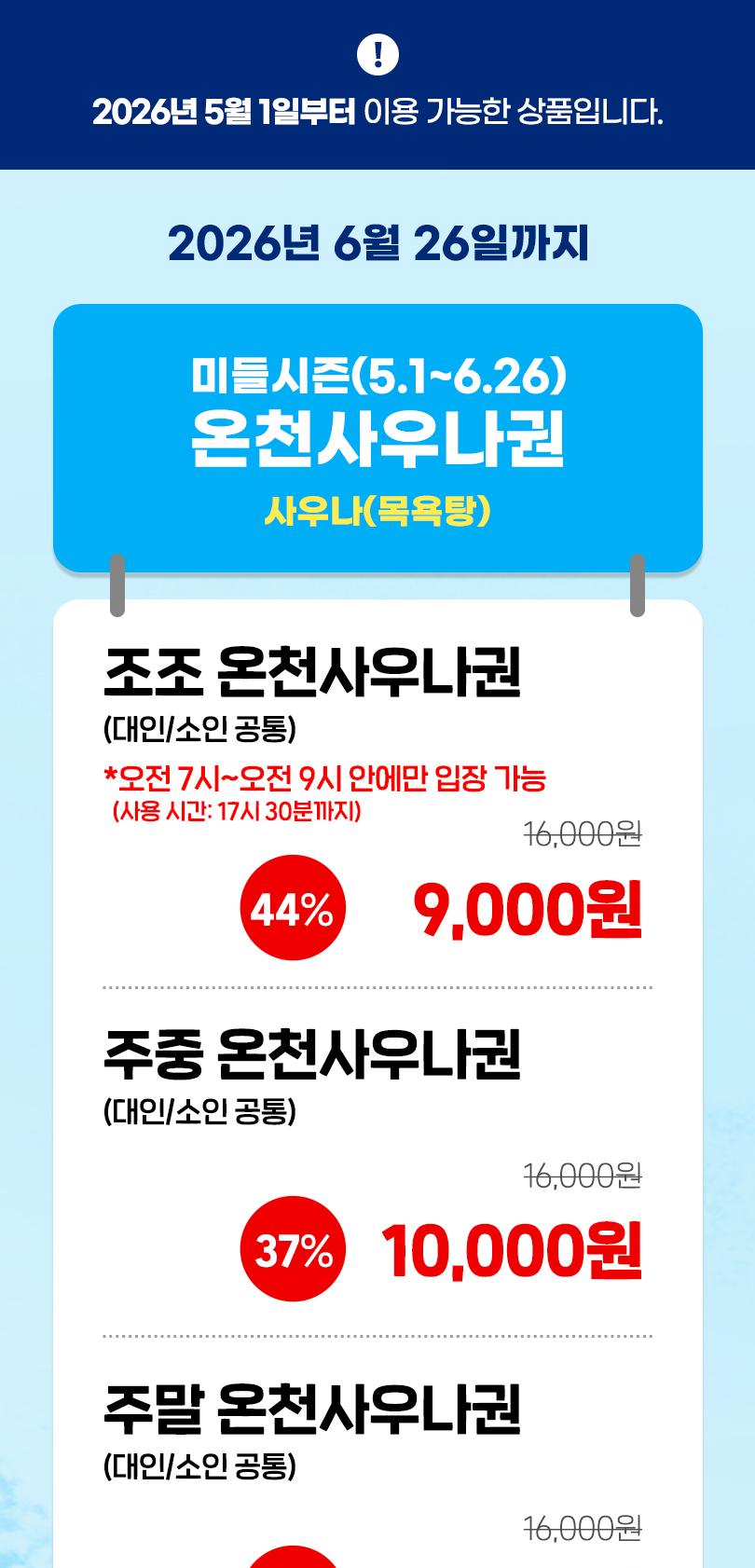 * 온천사우나 권종 티켓은 오전7시에서 오전 9시에만 입장 가능한 티켓입니다 (사용 가능 시간 : 17시 30분까지)
