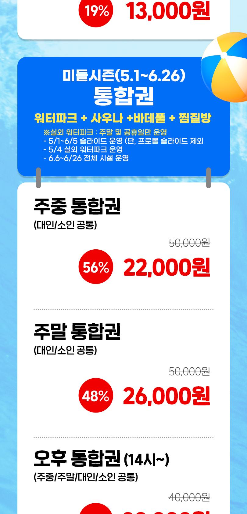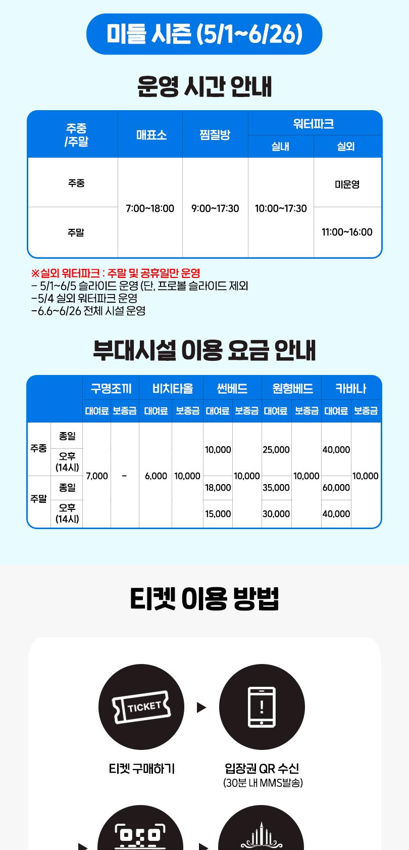 * 성수기 시즌/주말 또는 휴장 및 기상상황에 따라 경우 입장제한이 있을 수 있습니다.