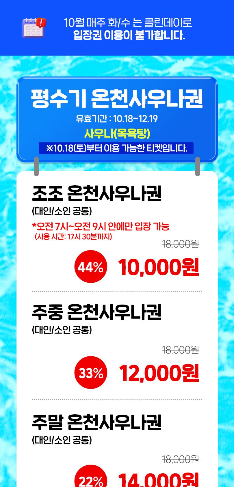 * 온천사우나 권종 티켓은 10/18(토)부터 이용 가능합니다. (유효기간 : 10/18~12/19)