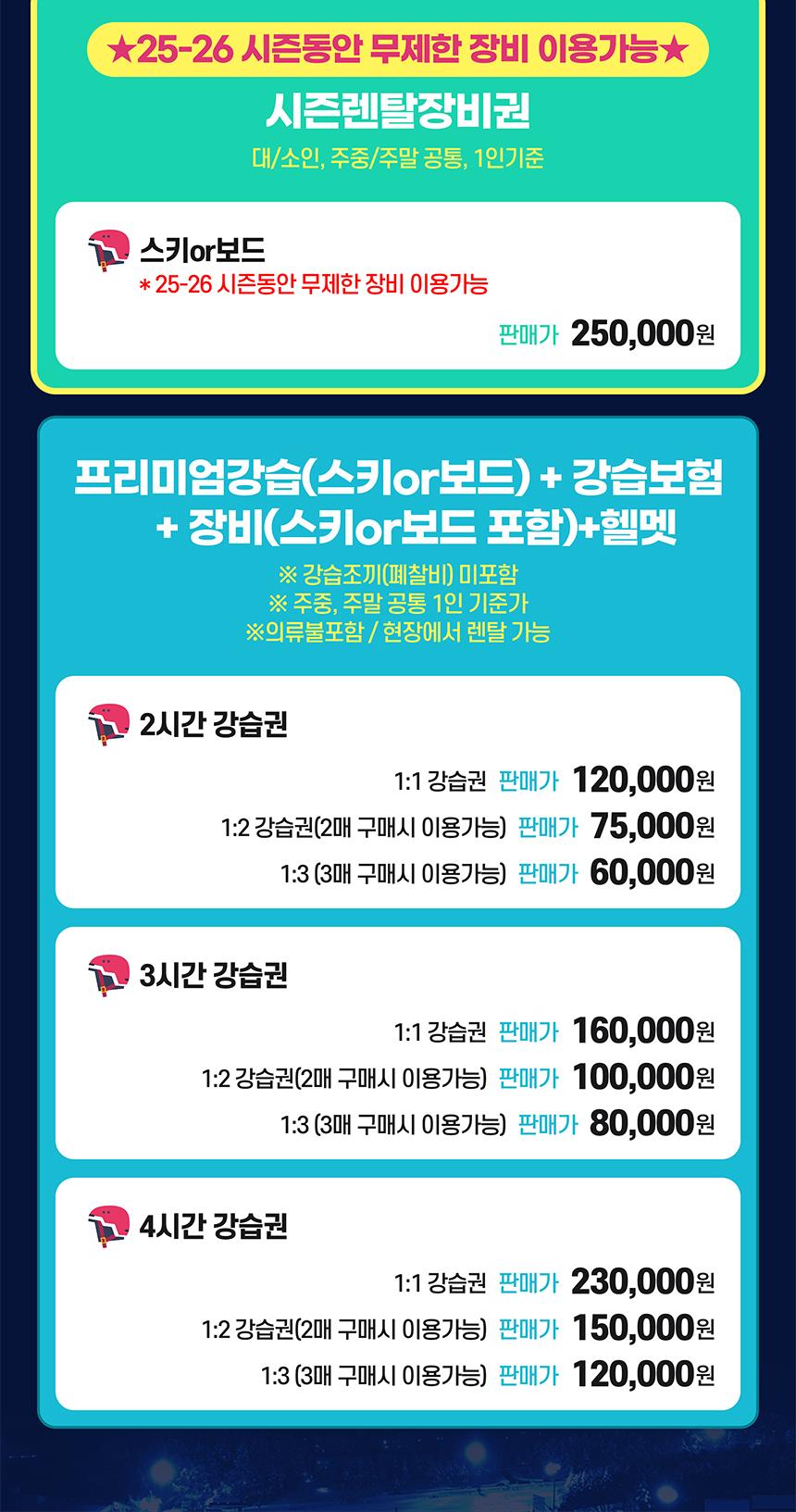 * 1) 강습상품: 현장에서 강습조끼 별도 구매 필수 (2시간권: 3만원, 3시간권: 4만원, 4시간권: 5만원)