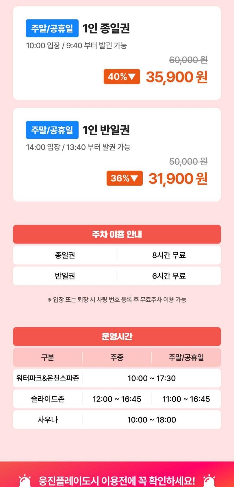 * 주차는 종일권 8시간 무료, 반일권 6시간 무료 (초과시 30분당 2,000원)