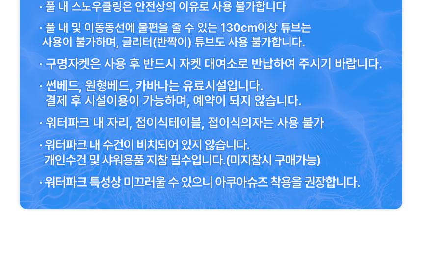 * 워터파크는 쾌적하고 청결한 수질 환경 유지 및 화재 예방을 위해 돗자리 및 음식물 반입과 버너등의 사용을 금합니다.