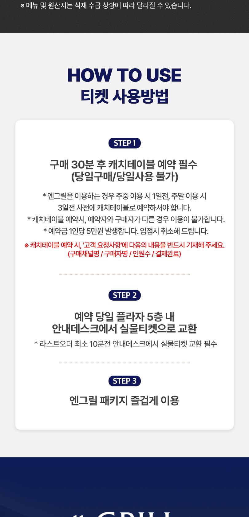 - 엔그릴을 이용하는 경우 주중 이용 시 1일전, 주말 이용 시 3일전 사전에 캐치테이블로 예약하셔야 합니다.