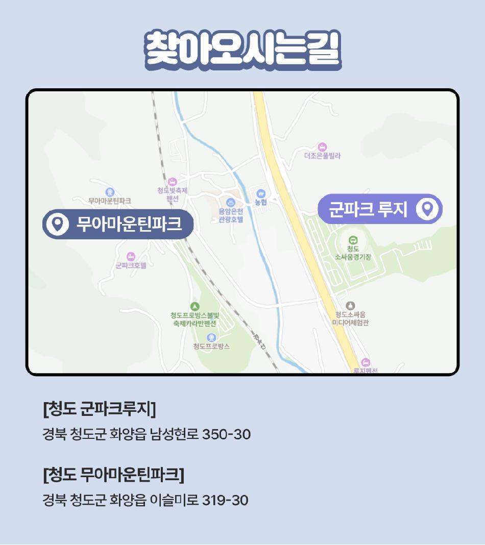 * 2) 우천시에는 출발 전 청도 루지 안내센터 (054-516-8888) 문의 또는 홈페이지/인스타그램 확인 후 방문 부탁드립니다.