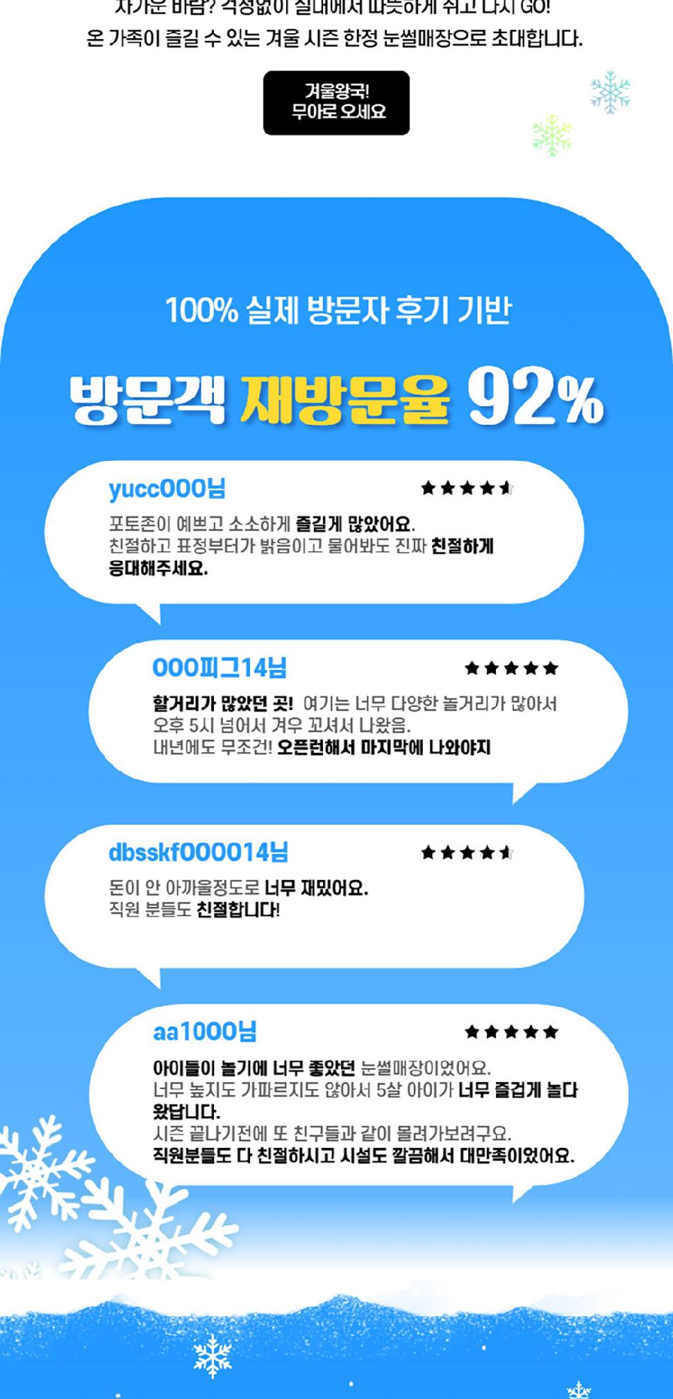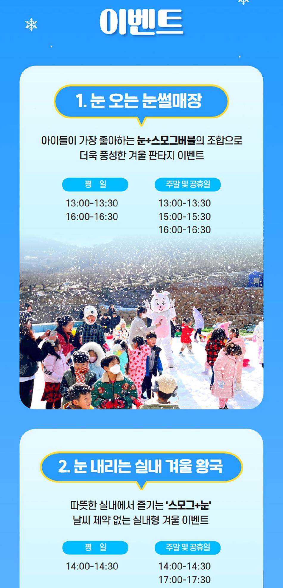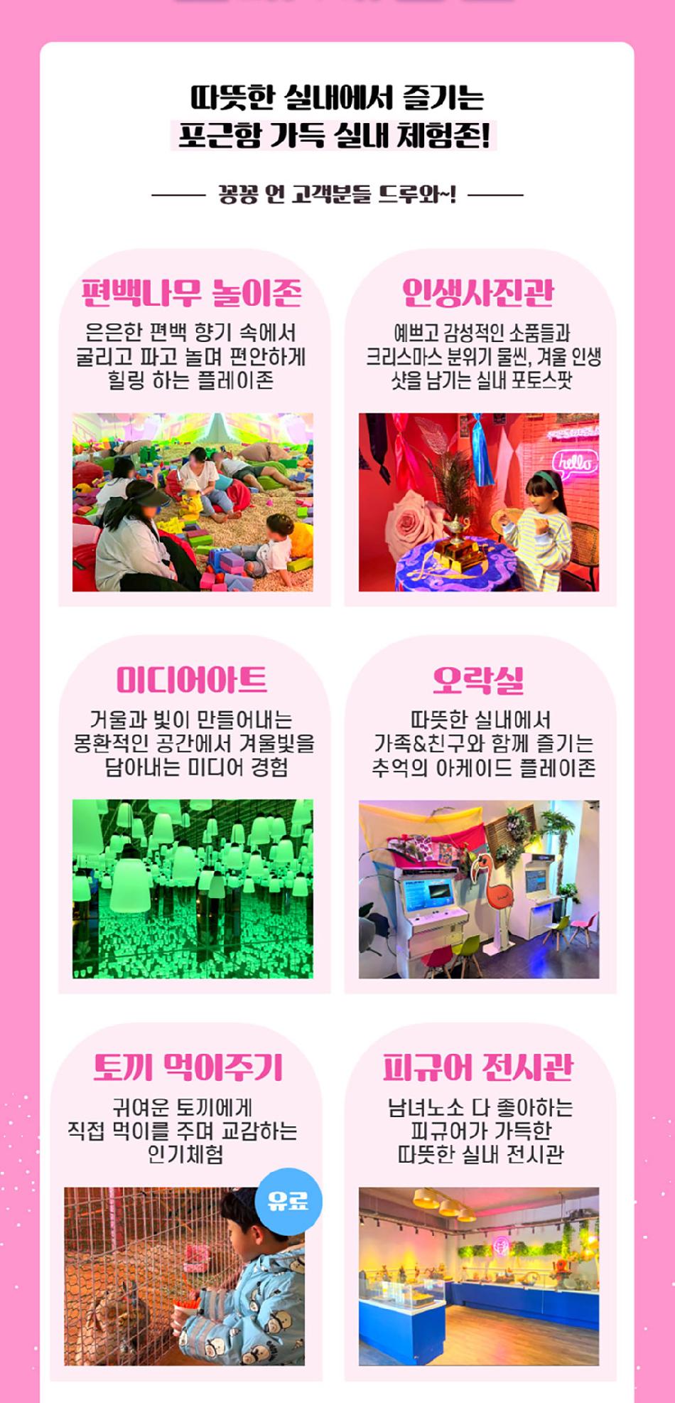 * 3) 실내(모래놀이, 편백나무, 미디어아트, 인생사진관, 색칠놀이존 등) 무료시설과 야외 눈썰매장, 눈놀이는 입장권에 포함되어있으며,