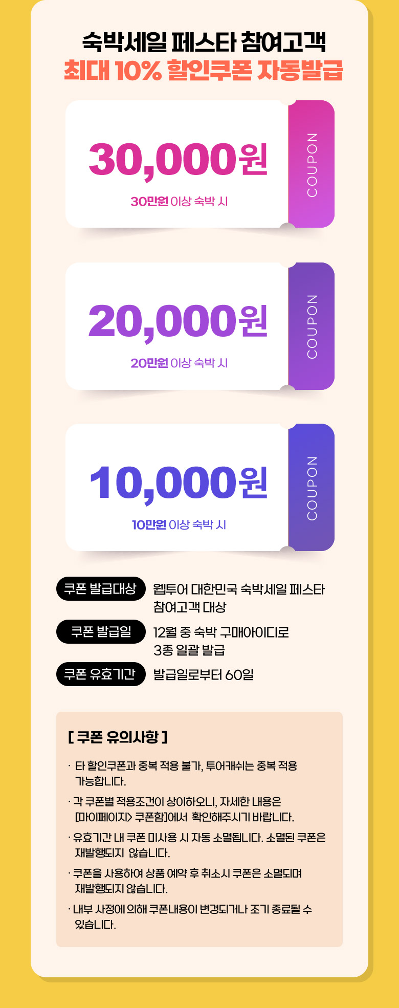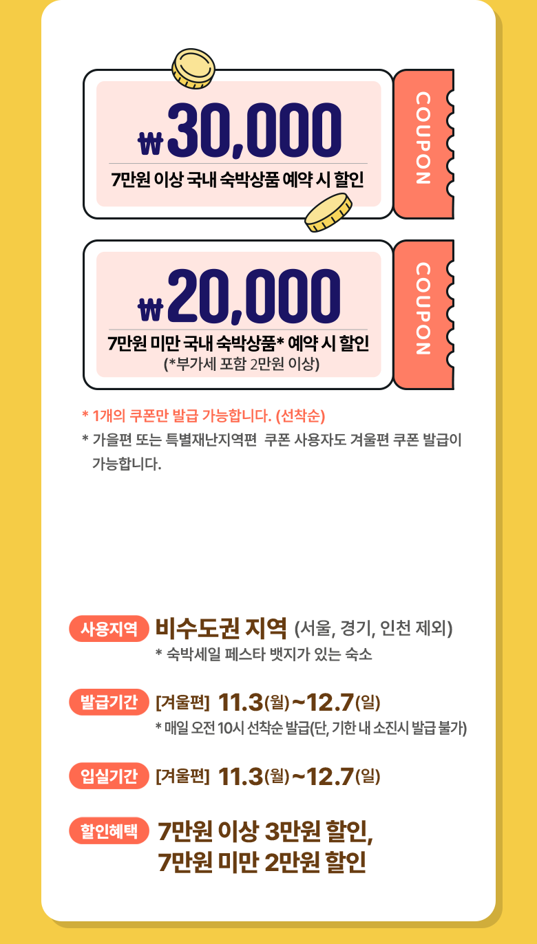 • 겨울편 할인쿠폰은 11.3(월) ~ 12.7(일) 입실 상품에 사용 가능합니다.