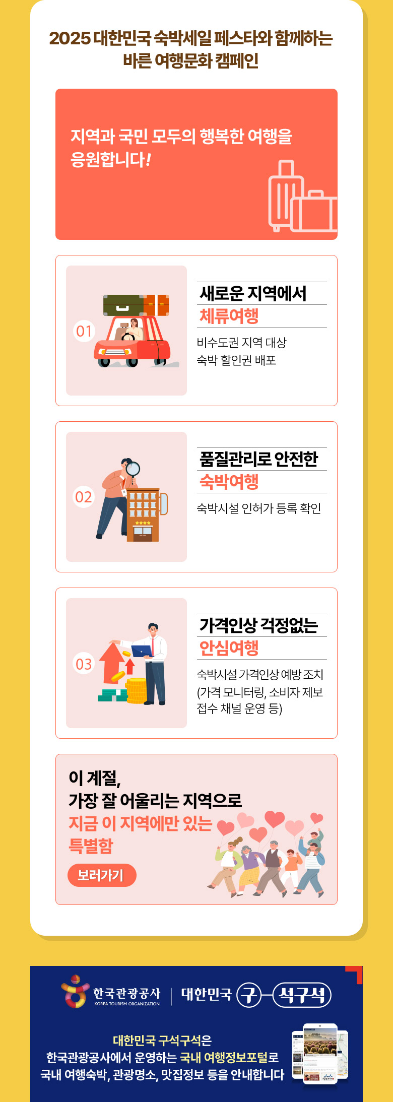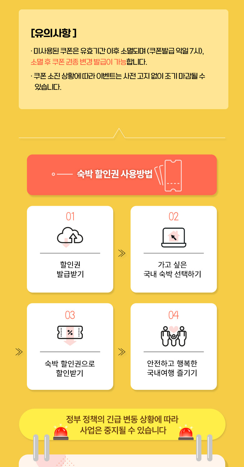 • 사용처 : 관광진흥법, 공중위생관리법 등에 등록된 국내 숙박업소(대실 사용불가, 캠핑시설 및 외국인도시민박업 제외)